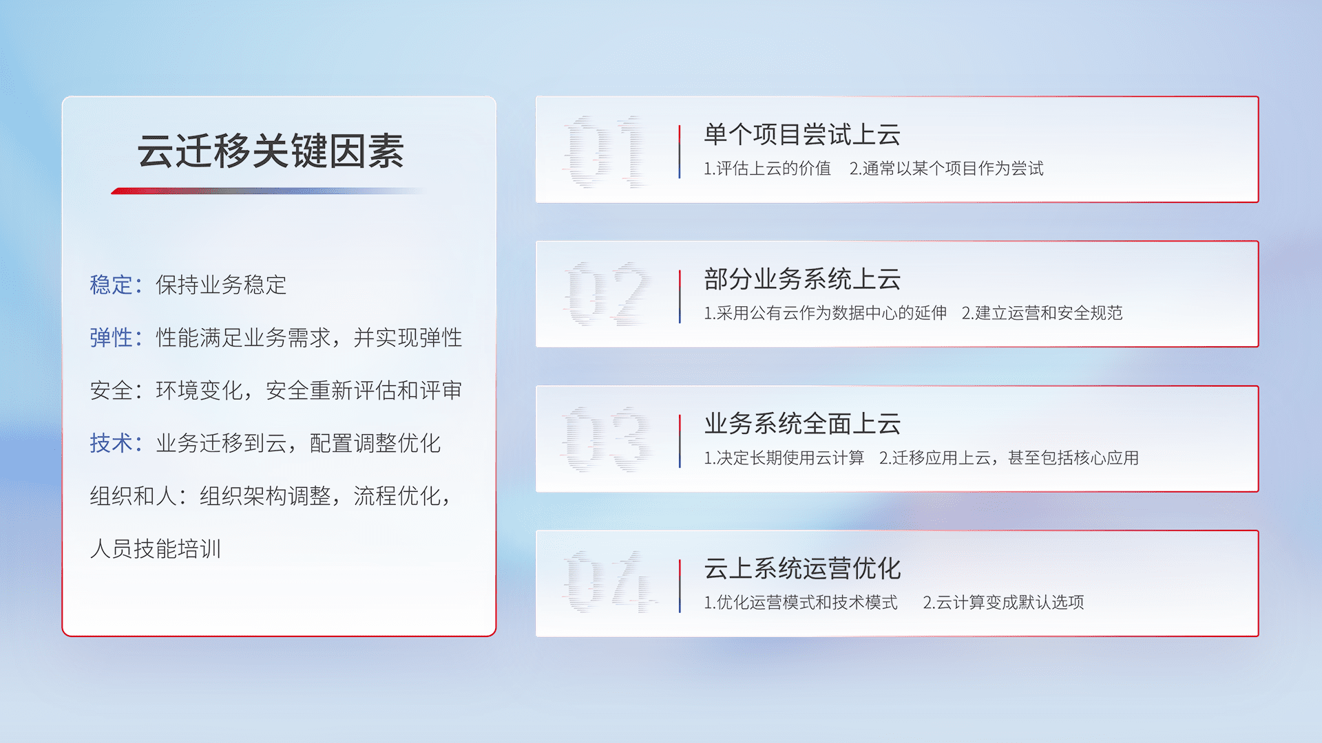 结合实际业务,,,,从规划设计、、、、云平台选型、、云原生改造、、、数据迁移、、、集成交付,,,迁移全过程为客户识别最佳上云路径,,,,做好风险识别管理,,,,设计网络架构、、、、身份权限、、、安全审计合规、、、操作审计、、日志审计、、、、监控告警策略、、、多站点容灾设计等,,对云上基础设施进行整体规划,,提升IT治理水平,,,以满足弹性、、、高可用、、高性能的需求。。。。
